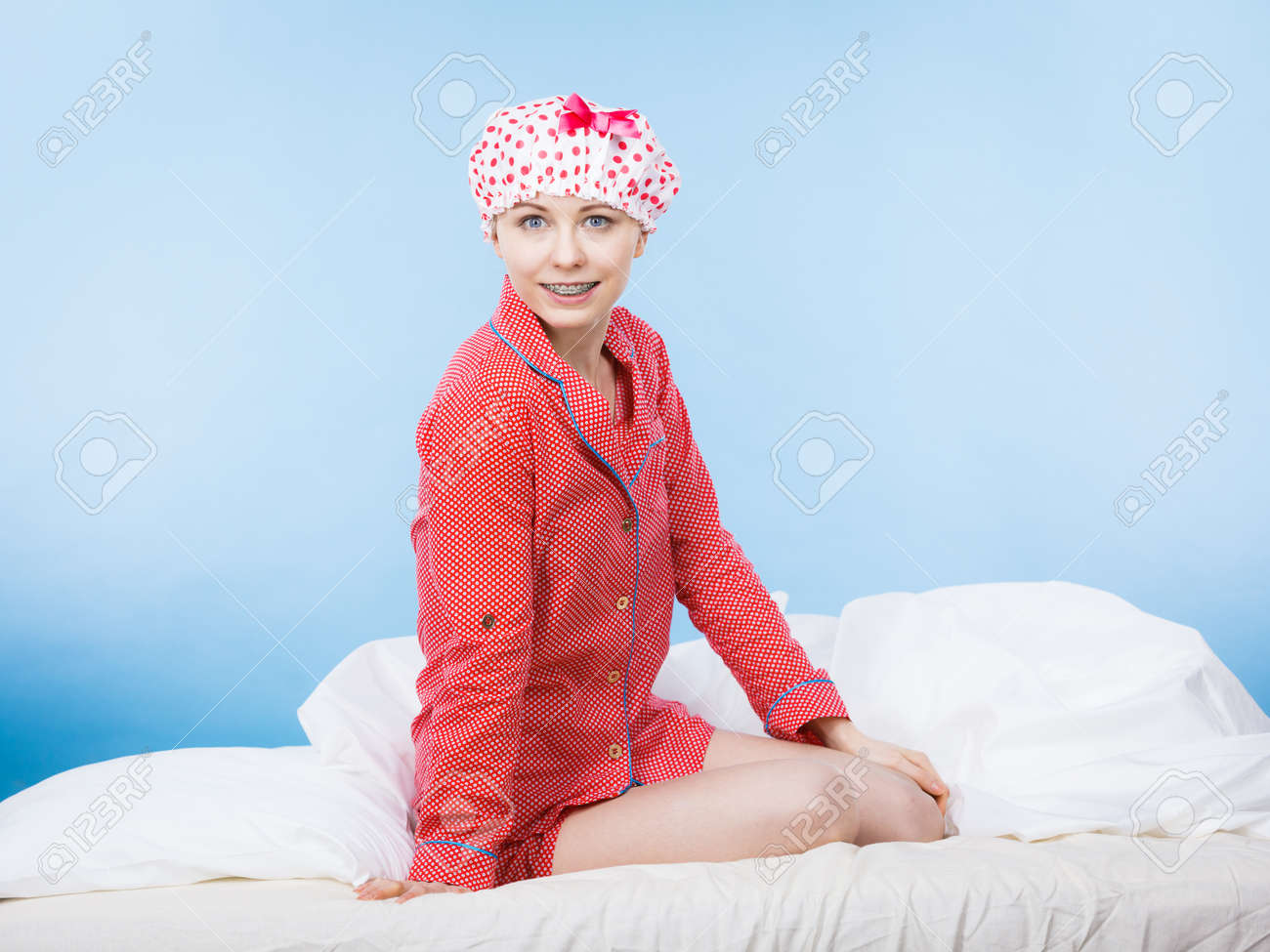 Scarica Gratis Pyjamas De Port De Femme Drole Et Chapeau Se Baignant Image Stock