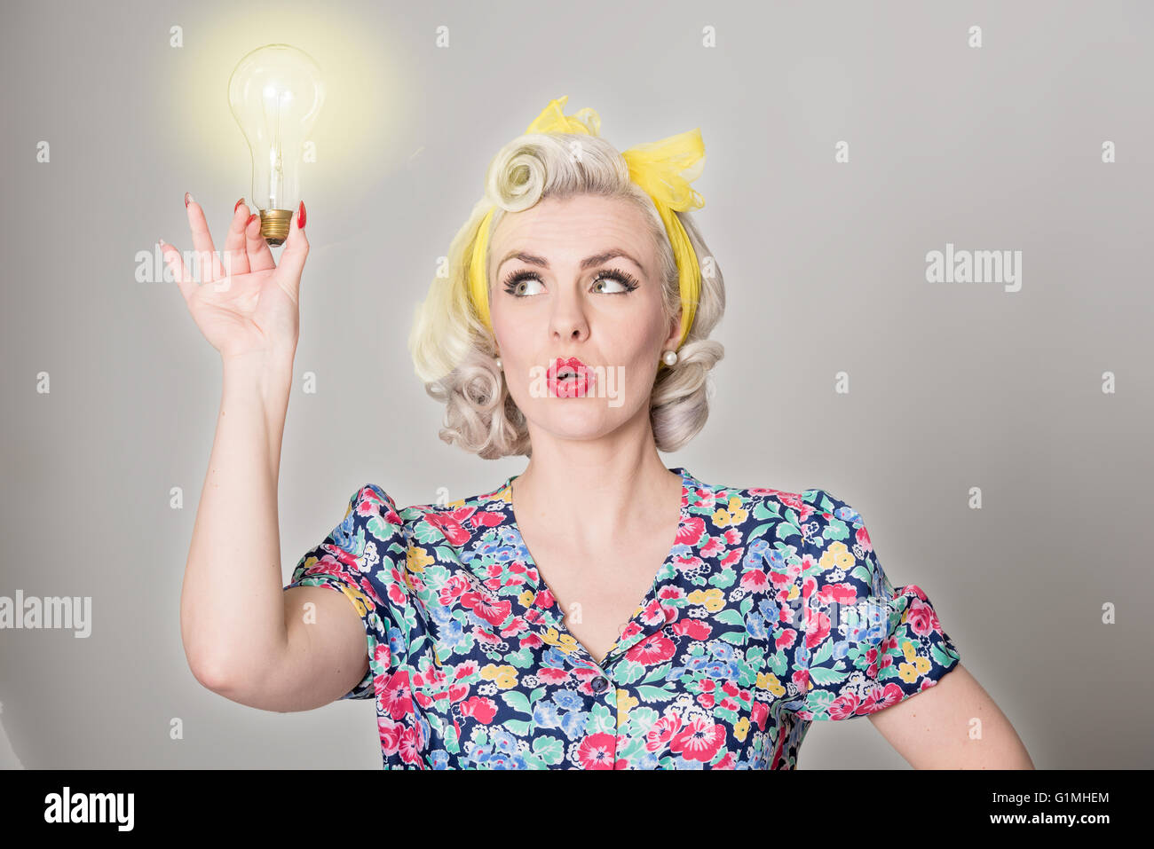Téléchargement gratuit Cute Blonde Girl Holding Glowing Light Bulb Concept Humoristique